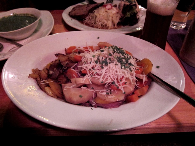 I started with beer, this time a dark wheat beer that I could really sink my teeth into. On a side note, I’ve been drinking beer with dinner the last few nights, because that has seemed to more closely fit the atmosphere of the restaurant. It seems wrong somehow to go to a bierhaus or tavern and order wine. I will eventually turn again to the local Rieslings and Gruners, but so far it has been a good decision and last night certainly didn’t disappoint.