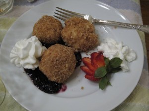 Another point … some recipes called for bread in the “dough” and this seemed wrong to me. The Topfenknödel I had in Austria didn’t seem to have bread in it, so I avoided these recipes. I ended up using a recipe that had flour, which worried me a bit, but worked out OK in the end. In the future I might try assembling the dough the night before, but this time I did it about an hour before I used it, and there wasn’t much time for the moisture to absorb into the flour, so it seemed perhaps too wet and sticky. More time would have been better, I think (but maybe that’s not right?).