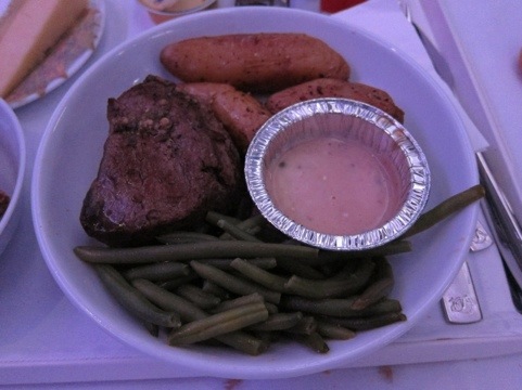 The main was pan-seared tournedos of beef with green peppercorn sauce, green beans, and potatoes. This was really good airplane food, but not great overall. I liked the green peppercorn sauce, which was creamy and piquant, and the beef was decent. Now that I’ve been using the sous vide machine I recognize it’s signature appearance, and this was clearly sous vide beef: browned on the outside and very uniformly pink throughout. It wasn’t outstanding beef but with the sauce I was satisfied. The potatoes and green beans were ok, if a little boring.