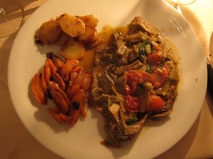 My secondo was a cutlet of veal with an artichoke sauce. The artichokes were fresh tender sweet and Unlike any other artichoke pasta sauce I’ve ever had before. This is why I’m growing my own artichokes – for dishes like this. This was served with potatoes that were panfried and infused with the flavor of onion, as well as roasted carrots. I don’t know how they got that much onion flavor and umami into these dishes but they were remarkable.