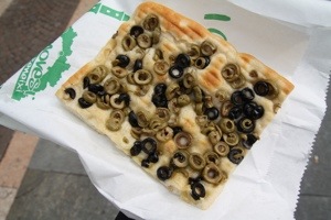 But the cheese was spectacular. Aged in local caves, I wanted to buy some to bring home. If I wasn’t a week from departure perhaps I would have. Lunch was found here, as well, and this slice of focaccia with olives was just the thing I needed. That and a cannolo!