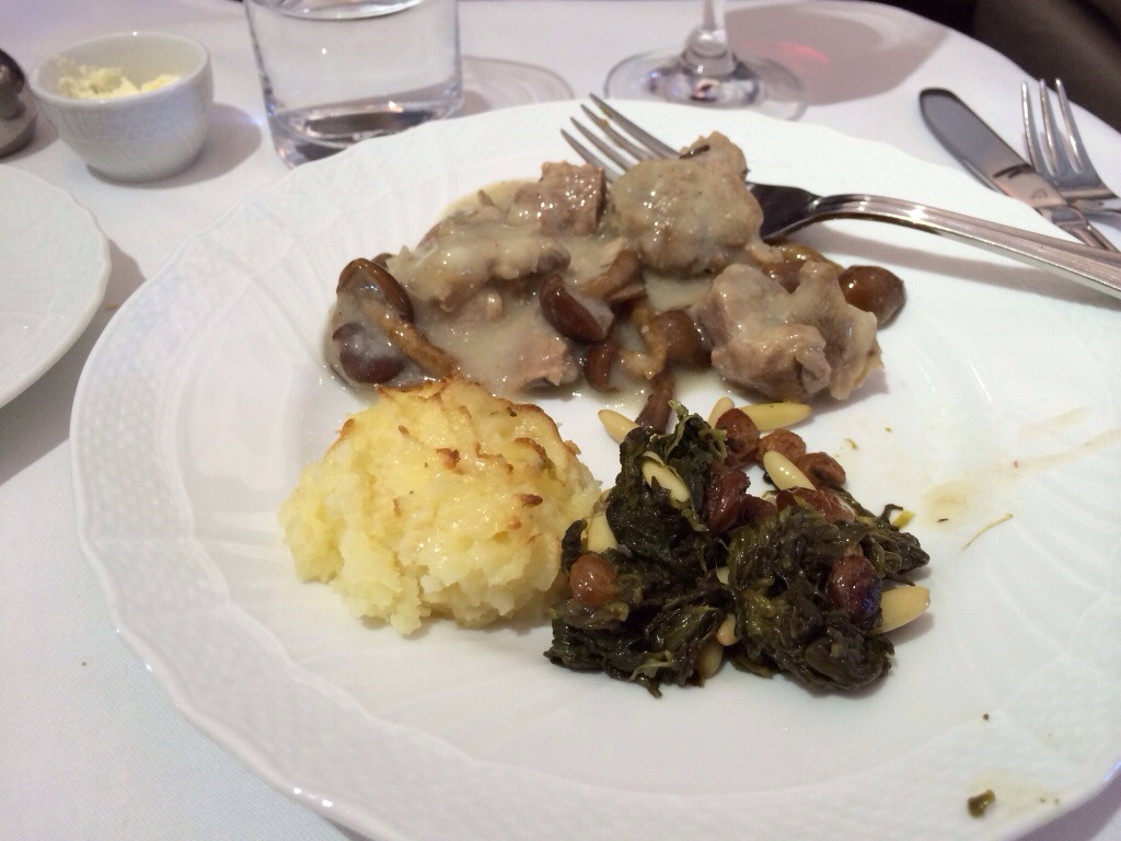 Next came lamb stew with thyme, laurel and yoghurt in a Pioppini mushroom sauce. I chose this rather than the roast salted codfish. It was fantastic and I was glad to see the recipe in the menu book. Perhaps I will make it sometime.