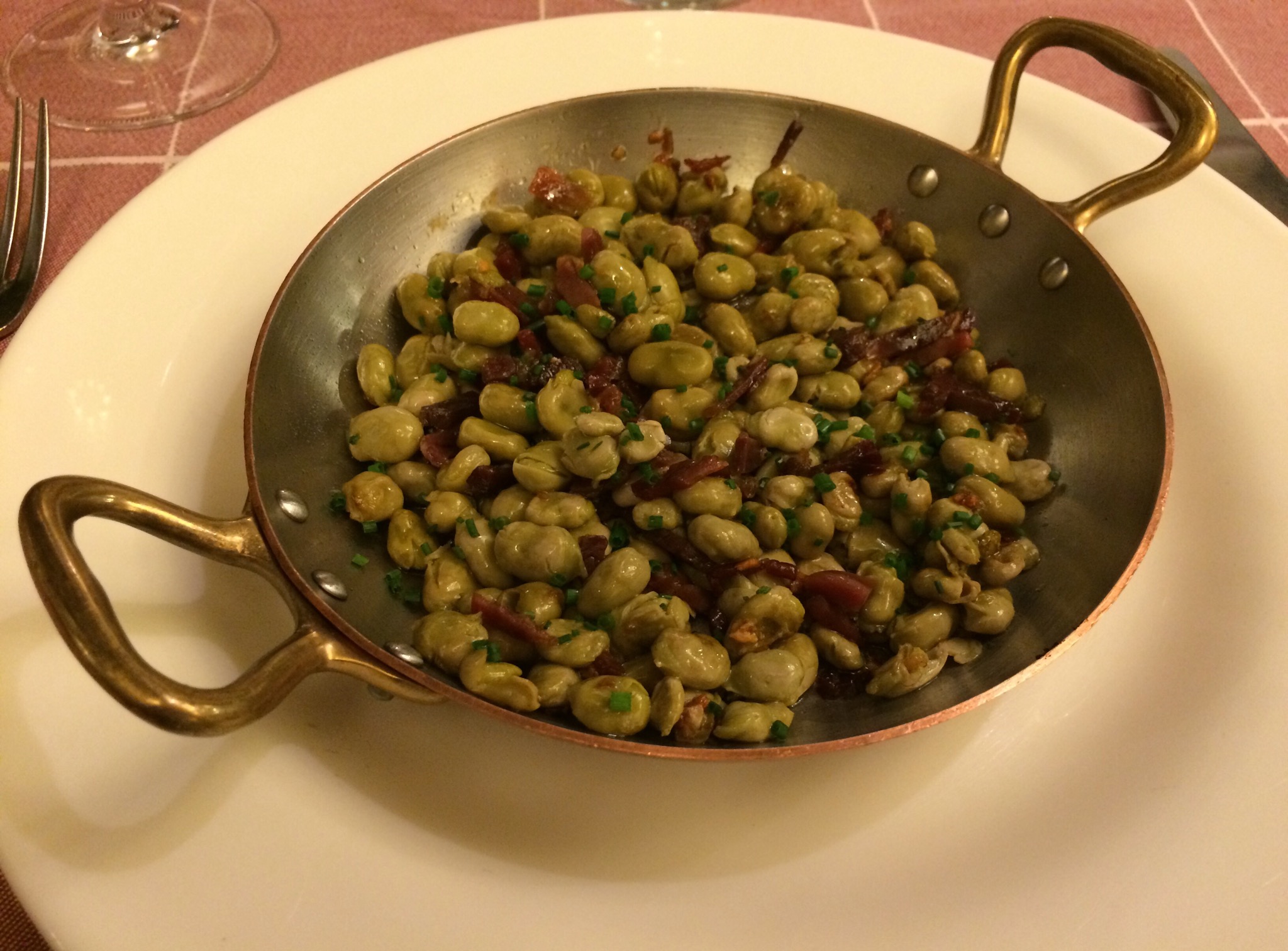 Dinner consisted of a first course of beans with ham. Theyre little fava beans, I think. I can’t imagine how long it took to peel them.