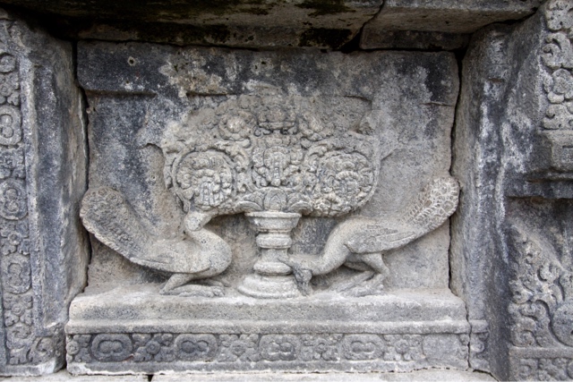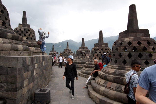 The temple, a Unesco World Heritage Site, was built in the 9th century when Java was Buddhist and Hindu. It was destroyed by an earthquake in the 11th century (Wikipedia disagrees with the guide, here) and was abandoned. It was discovered again in the 19th century and has been rebuilt as much as possible. Some of the building blocks were scavenged by locals.