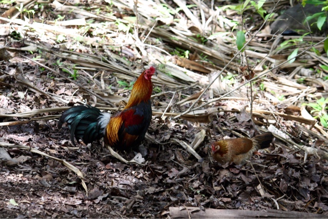 Our journey took us up again through overgrown forests where chickens watched us suspiciously. And we continued downward past makeshift steps until we were overlooking the sea. It was much calmer today than it had been a few days ago.