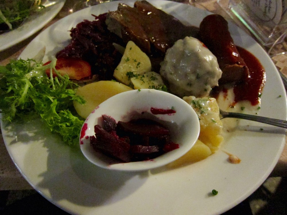 Finally, dinner came. I had ordered the Berlin Plate, featuring a light meatball in cream sauce, roast pork, half a currywurst (sausage with curry flavor – they’re very popular here), delicious red cabbage, beets, and potatoes. This gave me the opportunity to taste a little bit of everything, but the clear winner was the meatball – I really want more of that. And the cabbage.