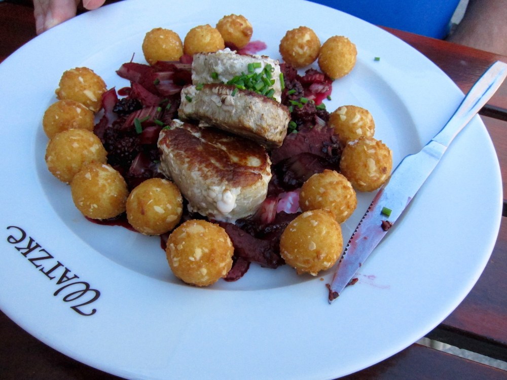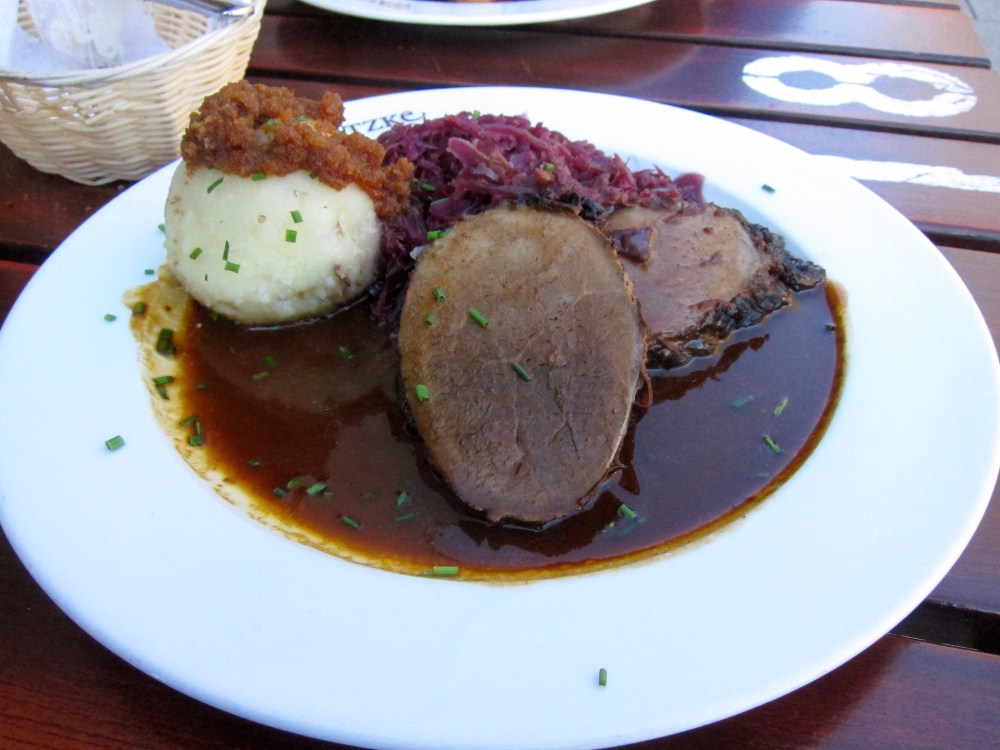 For dinner I had sauerbraten. This was one of Dad’s favorite things, so I couldn’t pass it up. It is beef marinated in vinegar, with red cabbage and a potato dumpling. As with most dumplings I have had in Germany and Austria, it sank like a piece of lead to the bottom of my stomach. That’s just how they make ’em.
