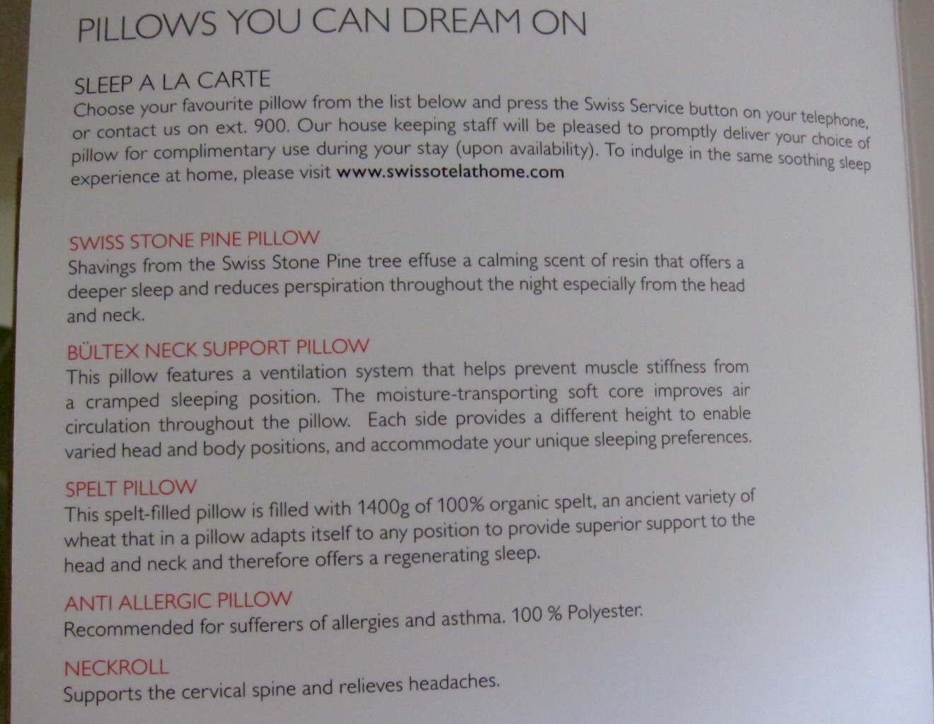 They offer this interesting service: they will bring you a pillow to address your specific requests. I tend to perspire a lot at night (you wanted to know that, I’m sure), and that stone pine pillow appealed to me.