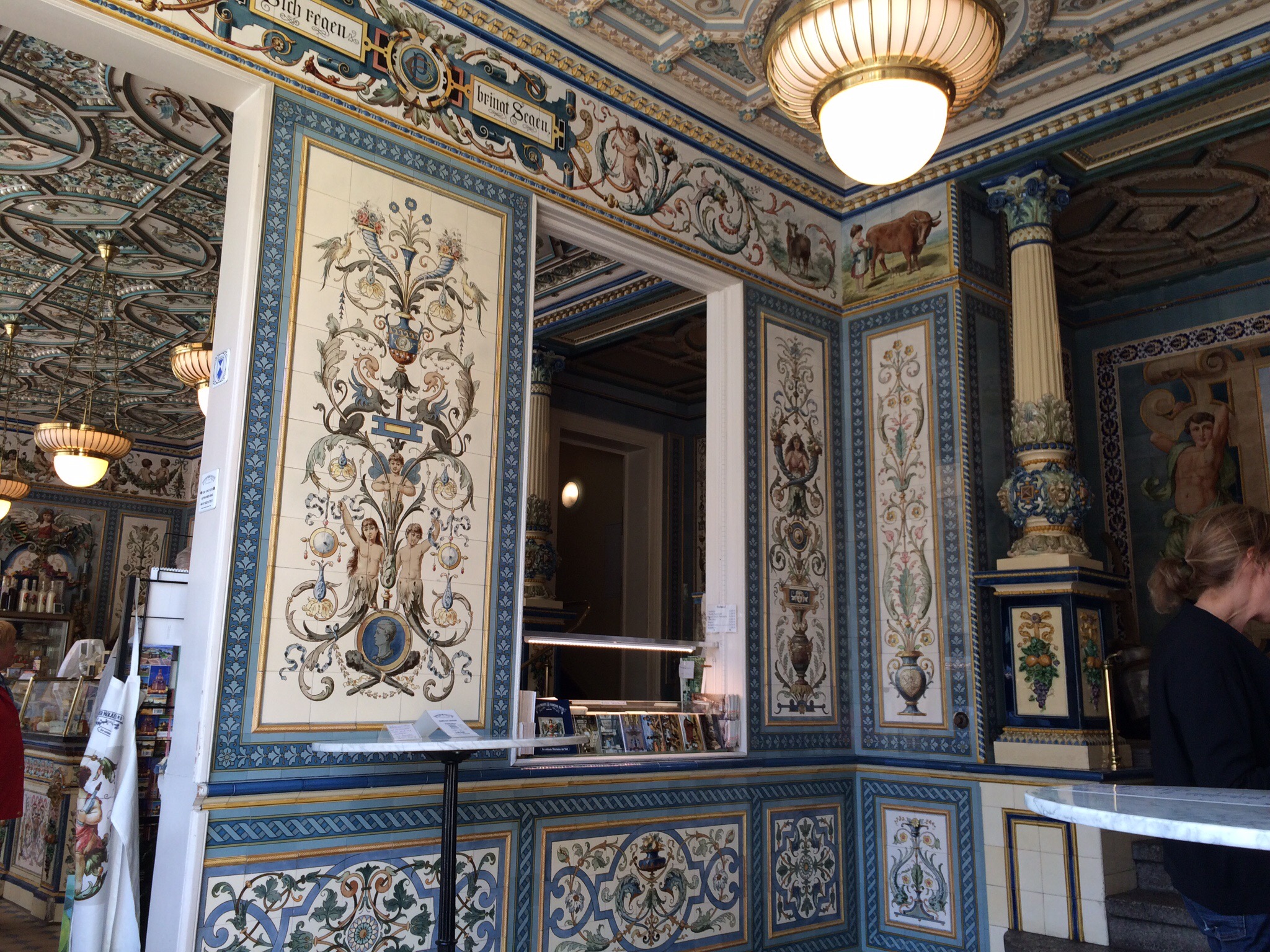 I descended and found D back at the hotel. He had a target in mind and we were off to the pfunds molkerei. This is a local dairy that also is known for the opulent ceramic work covering the inside of the building.