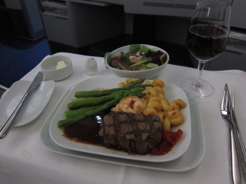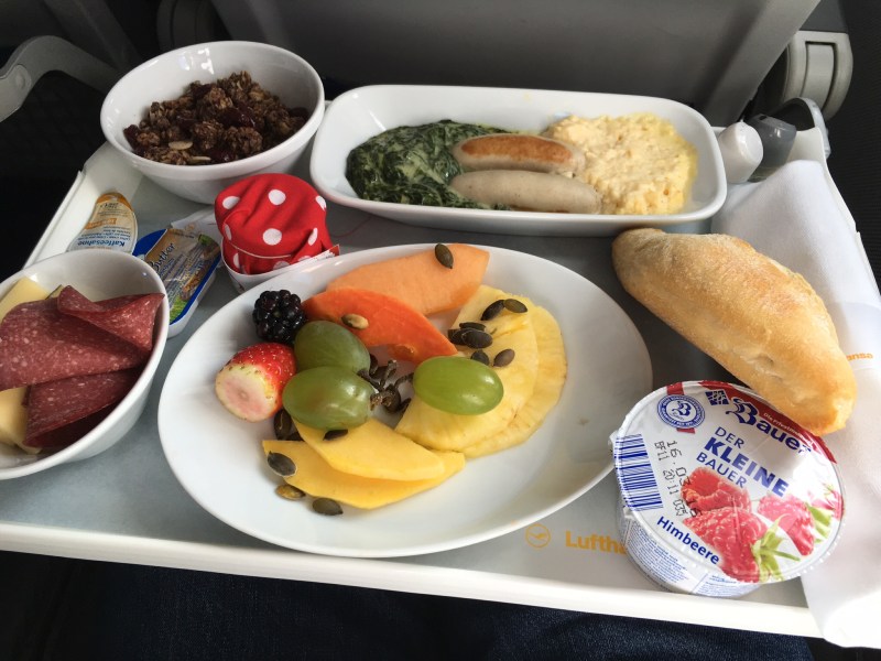 Yes! That’s it in the picture, there. And it was horrific. A crime against humanity. It looked good, but it tasted vile. See those white sausages? They are made of veal (not pork, given the destination) and somewhere a cow has lost her calf in vain. Somebody from the airline should find that cow and apologize to her in person, those sausages were so bad.