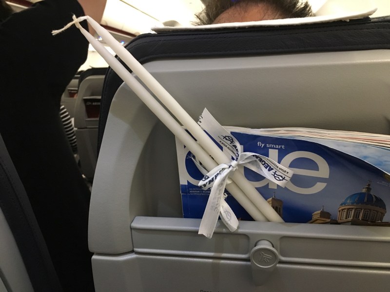 On this flight, operated by Olympic Air, they were handing out candles for celebration of Easter, but wouldn’t let us light them on the plane. I noted a priest (dressed in full vestments) in the first row, and can swear I smelled incense.