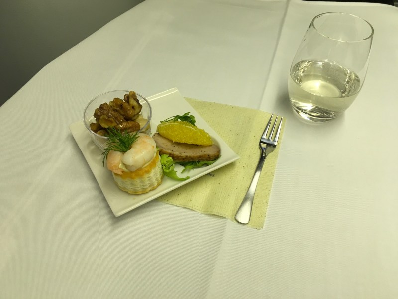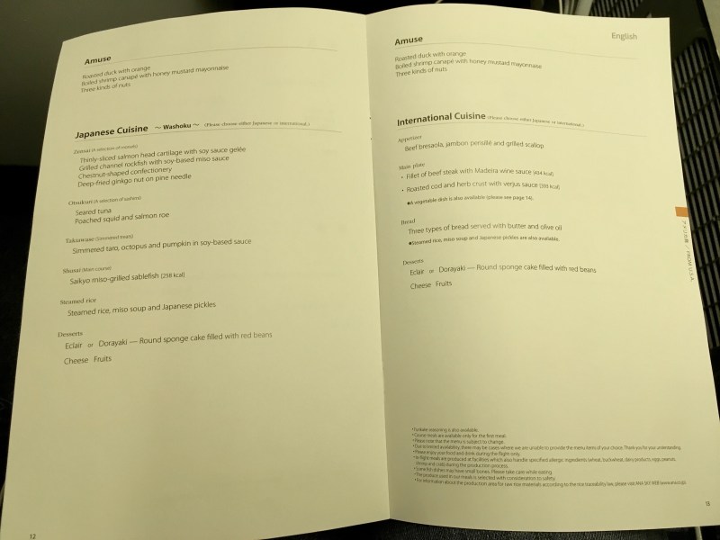 Once airborne, it isn’t long until the flight attendants bring us dinner menus, which quickly drive home a point – this is going to be different. Beyond the wine list there are sakes, shochus, and umeshu. I have only the vaguest familiarity with these things, so Yuki guides me to the first sake on the list to pair with the amuse bouche of roasted duck with orange, shrimp canapé, and nuts.