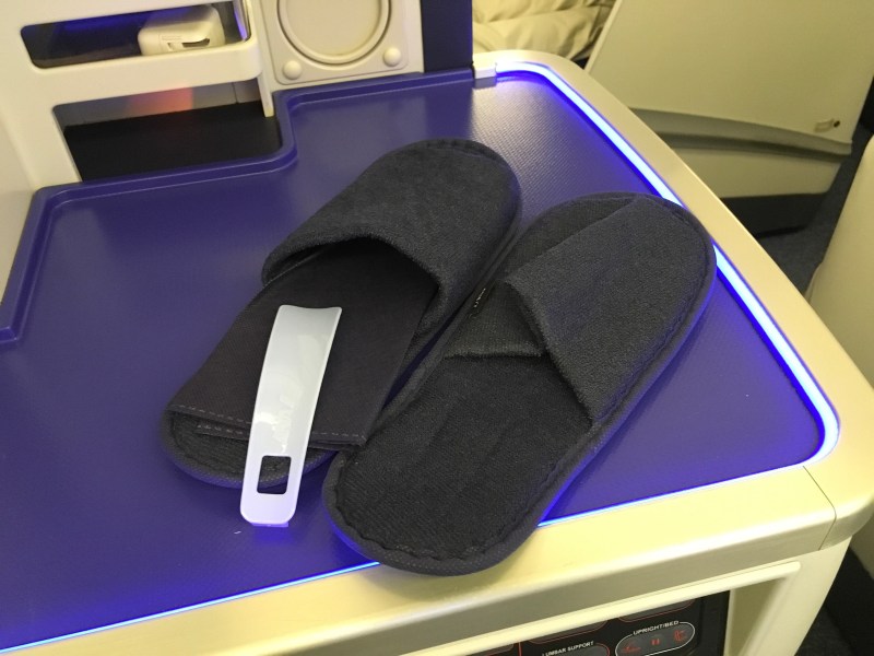 I’m flying on ANA for this leg and the service is assiduous. Yuki is my flight attendant, and is very good about explaining things to me. Immediately on boarding, I notice a few differences from other airlines with whom I have flown. For example, rather than socks, they give us slippers and a shoehorn with which to slide them on.