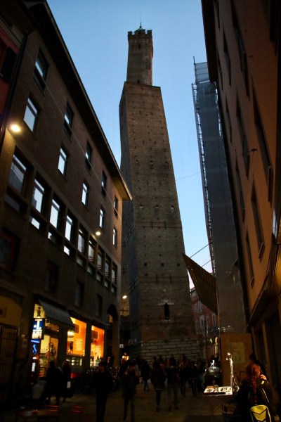 When I finally reached Via Zamboni, I turned right, and followed the street to the center of town, where Le Due Torri, the The Towers of Asinelli and Garisenda, stand askew over the intersection with Via Rizzoli, right in the center of town.