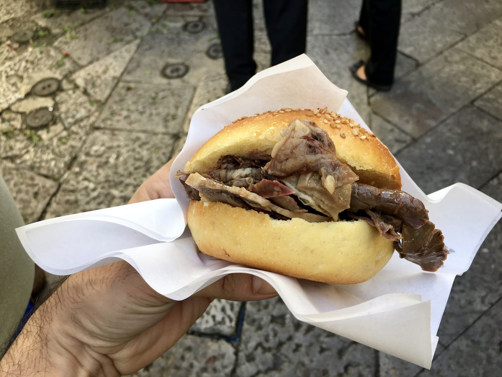 And I found this sandwich. I’ve had one once before – a pani ca meusa. Palermo is famous for her street food, and this sandwich, featuring beef spleen, is one of the more well-known items available. There is a process to assembling the sandwich. As the bun is cut, a napkin is laid over the bottom bun. The meat, which is cooked in oil, is then dished over the napkin/bun, so that plenty of oil is transferred, but not too much. The top then goes onto the sandwich and the napkin is discarded. Finally, the sandwich is finished with salt and lemon juice. It was delicious.