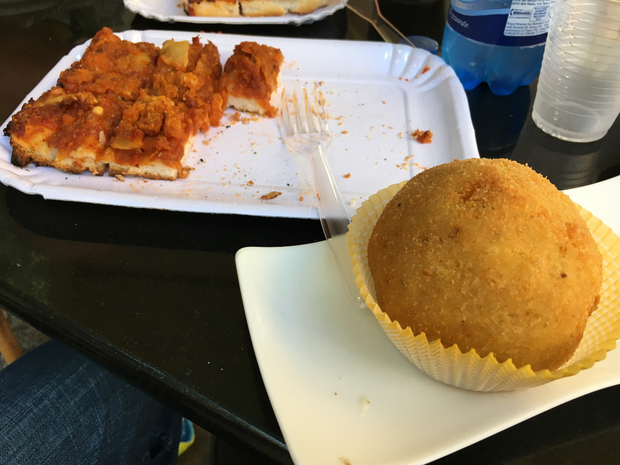 He did better with lunch. He didn’t have the sfincione, as most people who make it seem to use anchovies, instead opting for pizza. I had the sfincione, as well as a rice ball. All were delicious.