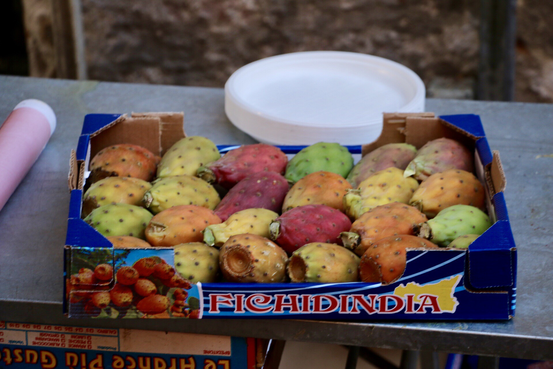 Below, we found exotic fruits and vegetables, such as these gorgeous prickly pears, opulent gems arrayed in a cardboard box.