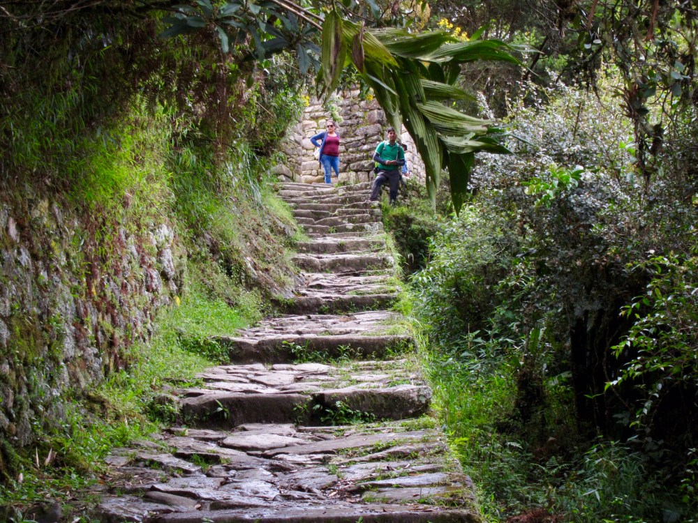 Thus began our grand descent through a world in which all colors had been obliterated except for muted shades of grey and green. We left our camp, sitting at 12,000 feet, braving the slippery steps as fast as we safely could, our vision impaired by the rain, the dark, and the hoods of our ponchos.