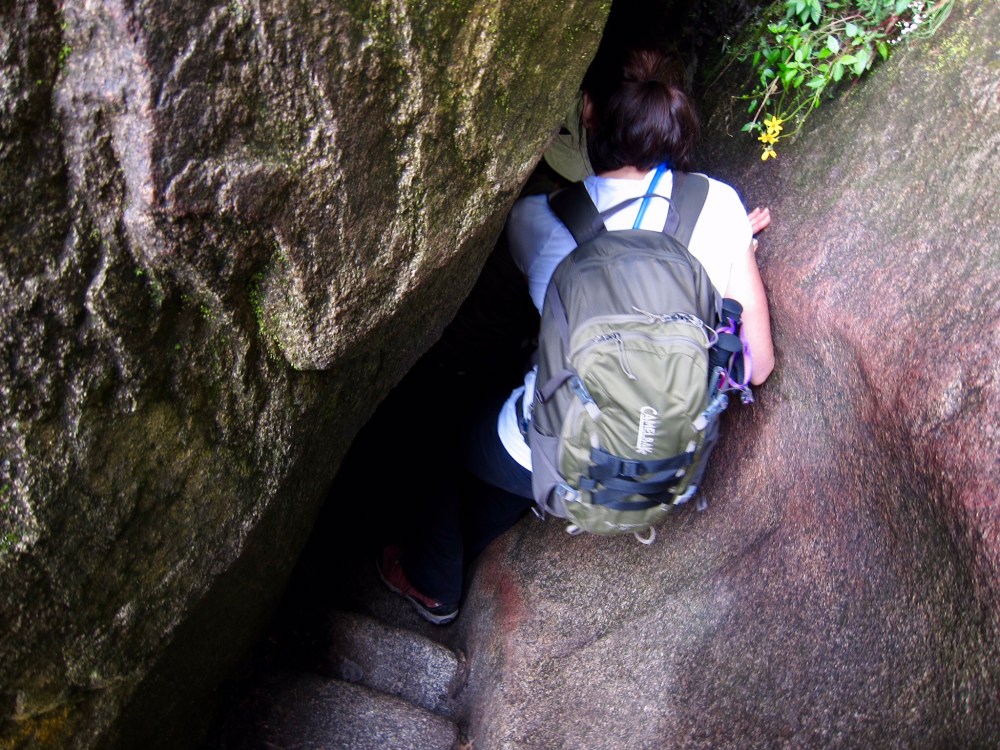 Beyond the stairs, near the top of the mountain there is a small, angled tunnel that visitors must navigate.