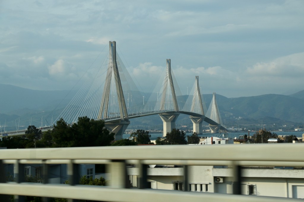 The Rio-Antirrio Bridge is not old – instead it is a very modern cable-stay bridge that connects Western Greece to Mainland Greece over the Gulf of Corinth. One of the world’s longest cable-stay bridges, it is beautiful; a graceful compilation of steel brush strokes and concrete lines, with linear rays of twisted cable blending into impossible curves.