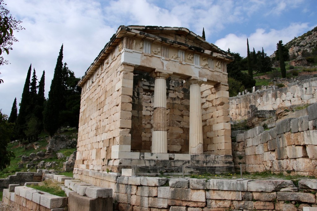 We continued higher, exploring this very vertically structured site, to where the Treasury of Athens has been rebuilt.