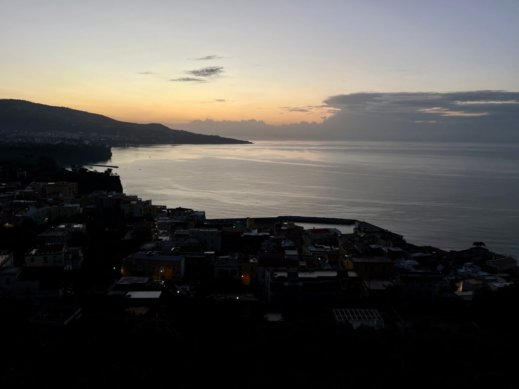 In the darkening purple light of a disappearing day, we wound down toward the Amalfi Coast via the pass that cuts from the northern side of the Sorrentine Peninsula to the southern, hugging hairpin turn after hairpin turn.