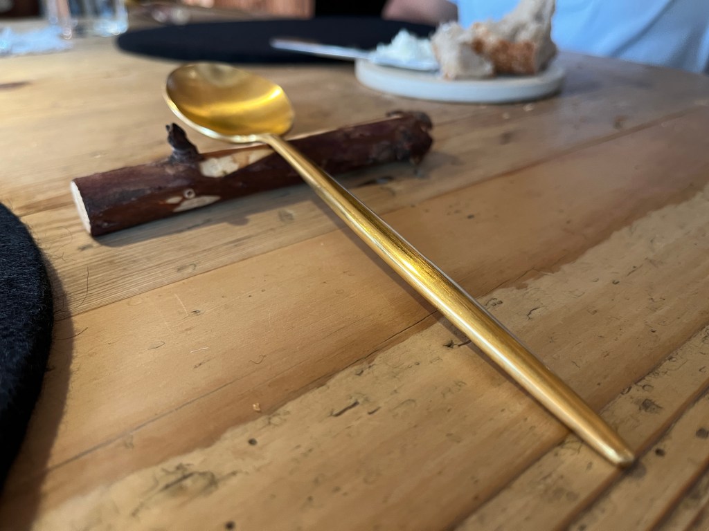 We were then served sublime char, and this golden spoon was the flatware of choice for a decadent cauliflower cream with burnt lemon and trout broth.