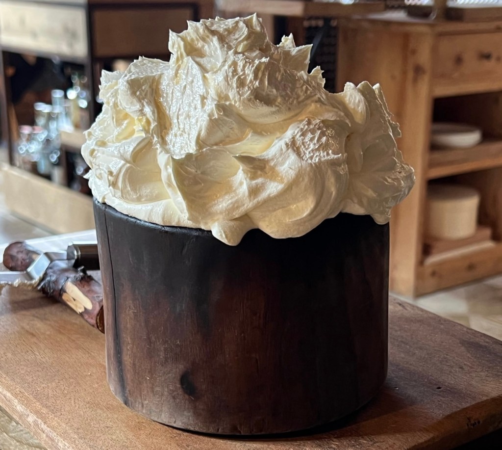 The bread was homemade, and served with butter (from the farm) that came out of the kitchen presented in a massive bucket in spiky peaks, looking like a meringue. From there it was dolloped onto a large chilled stone that sat at the center of the table. It was beautiful, tasting of grass and the flowers of the autumn meadow.