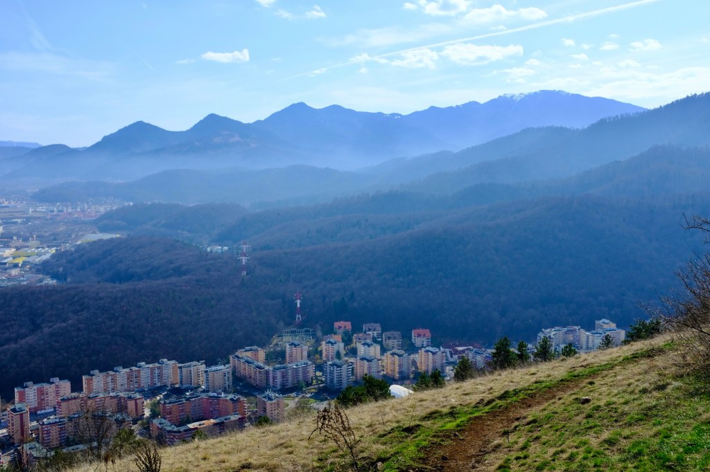 I expected that somewhere along the way I would stumble across a nice view of Braşov, but this never materialized. Instead, about a third other the way down I found a spectacular view from opposite side of Mt. Tampa, with the pale blue mist of late morning still clinging to the other mountains to the east.