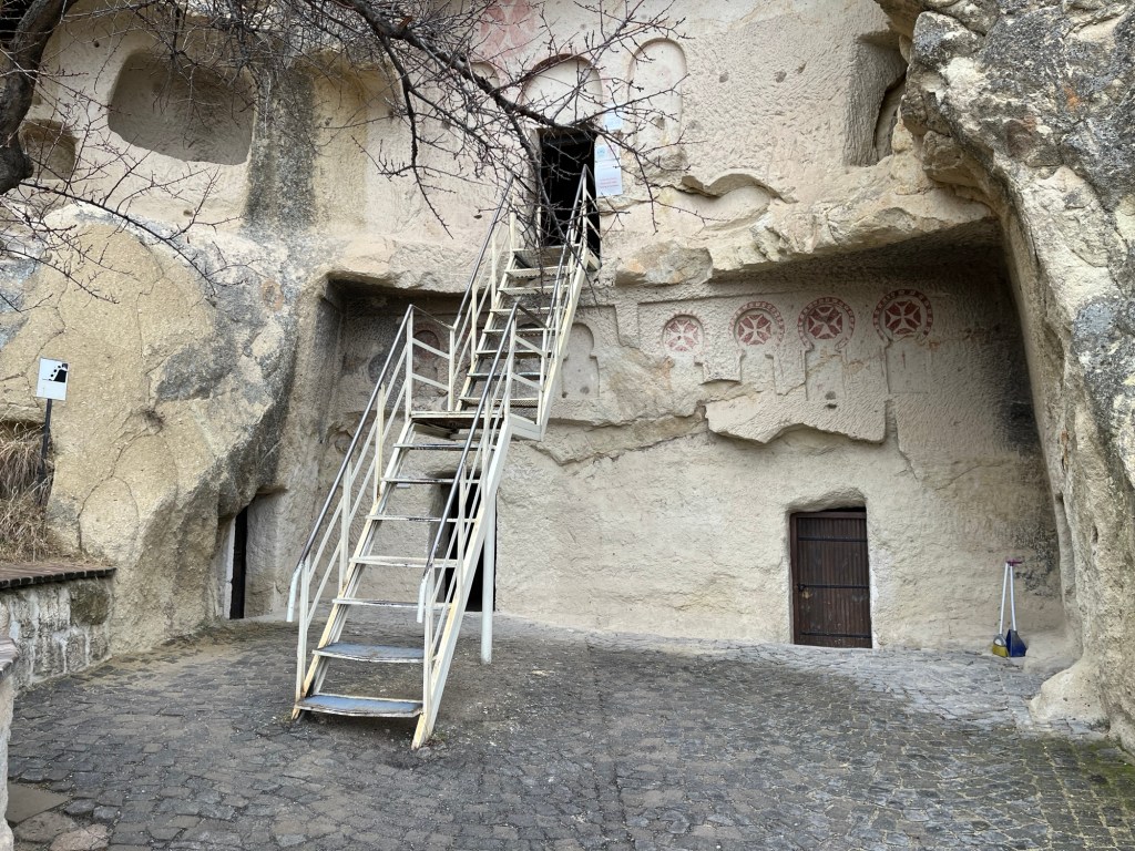 It was drizzling when we arrived at our next stop, the Goreme Open Air Museum, which, centuries ago had once been a monastery. In 200 AD Early Christians began fleeing to this place seeking refuge from a Roman Empire that would persecute them, and it would peak sometime between 600 and 1600 AD (I find quite a range of dates on this).