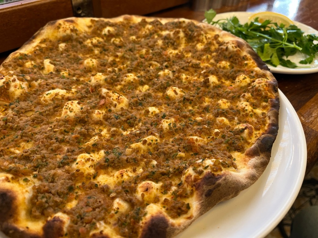 I paused at a small shop for a late lunch of lahmacun, a thin crispy flatbread topped with ground meat. It’s a sort of Turkish pizza. Most people seem to order two, but I wasn’t especially hungry and just had one.