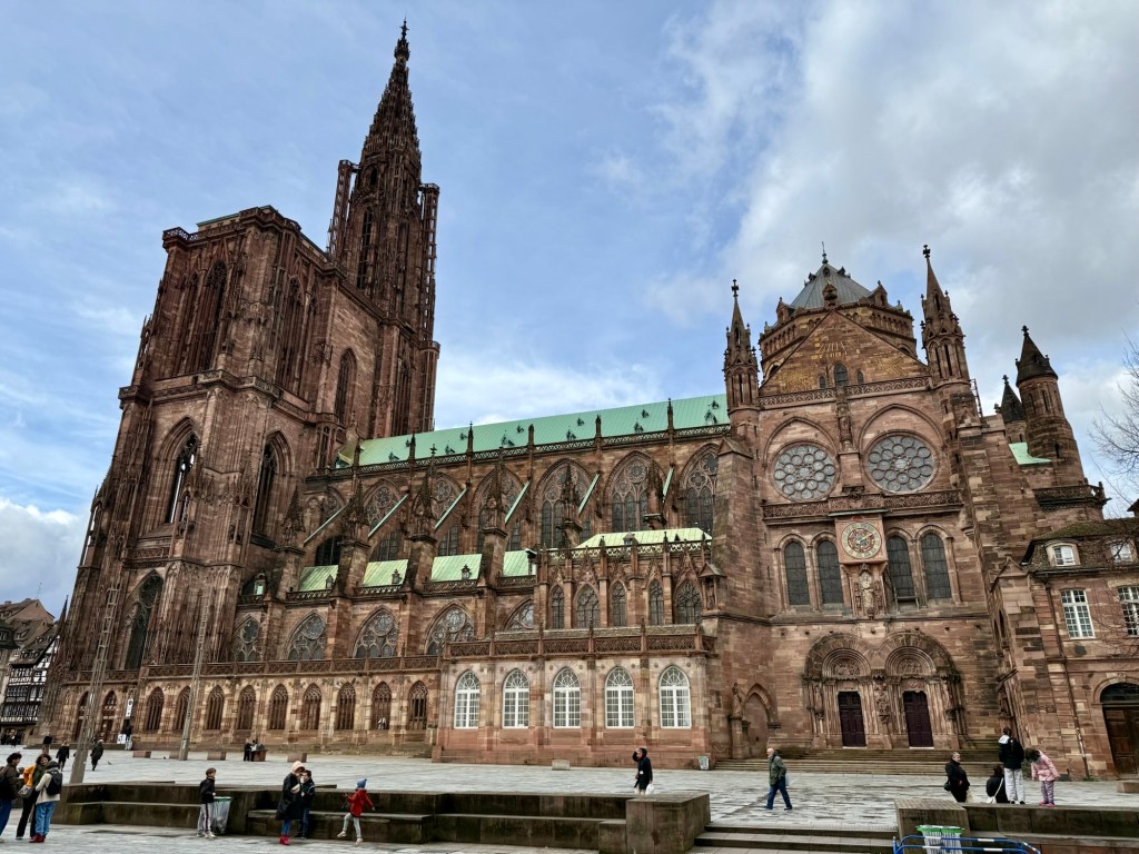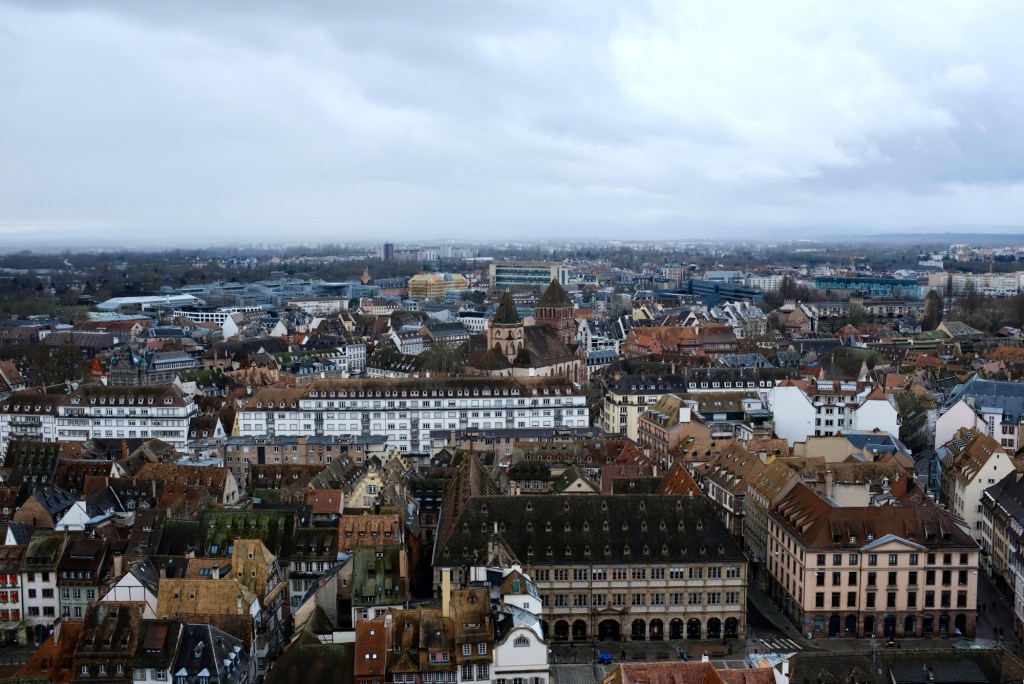 The clouds were low and I could just barely see the Vosges mountains to the west, but what I got was better than the views: I got to see the church up close.