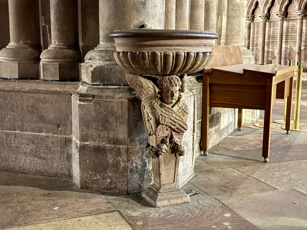 Even so, I do my best to find things to relate to, and this stoup in the Strasbourg Cathedral was one such item that captured my imagination.